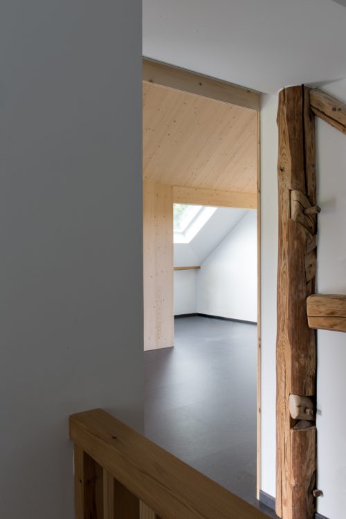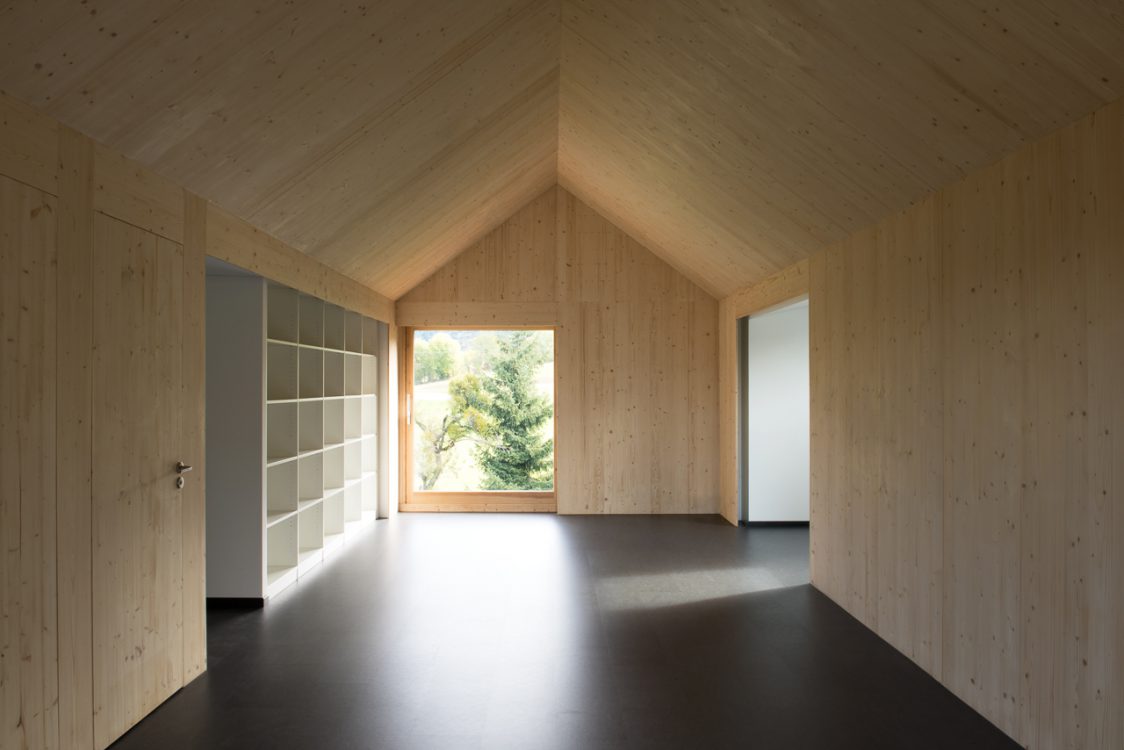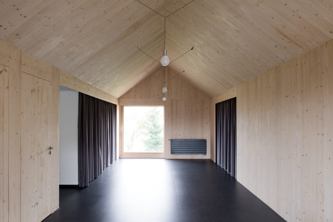 L’espace central, multifonctionnel et généreux, profite de la grande hauteur sous le faîte et traverse de part et d’autre la bâtisse, en se prolongeant même au delà à travers d’importantes baies vitres qui cadrent les montagnes environnantes. S’accrochent à cette nef centrale une série d’espaces servants mansardés et éclairés zenithalement, tels les niches faisant office de chambres d’appoint, les salles d’eau, la circulation verticale et des rangements. Un jeux de rideaux permet de moduler les rapports entre les espaces, selon les besoins d’utilisation.